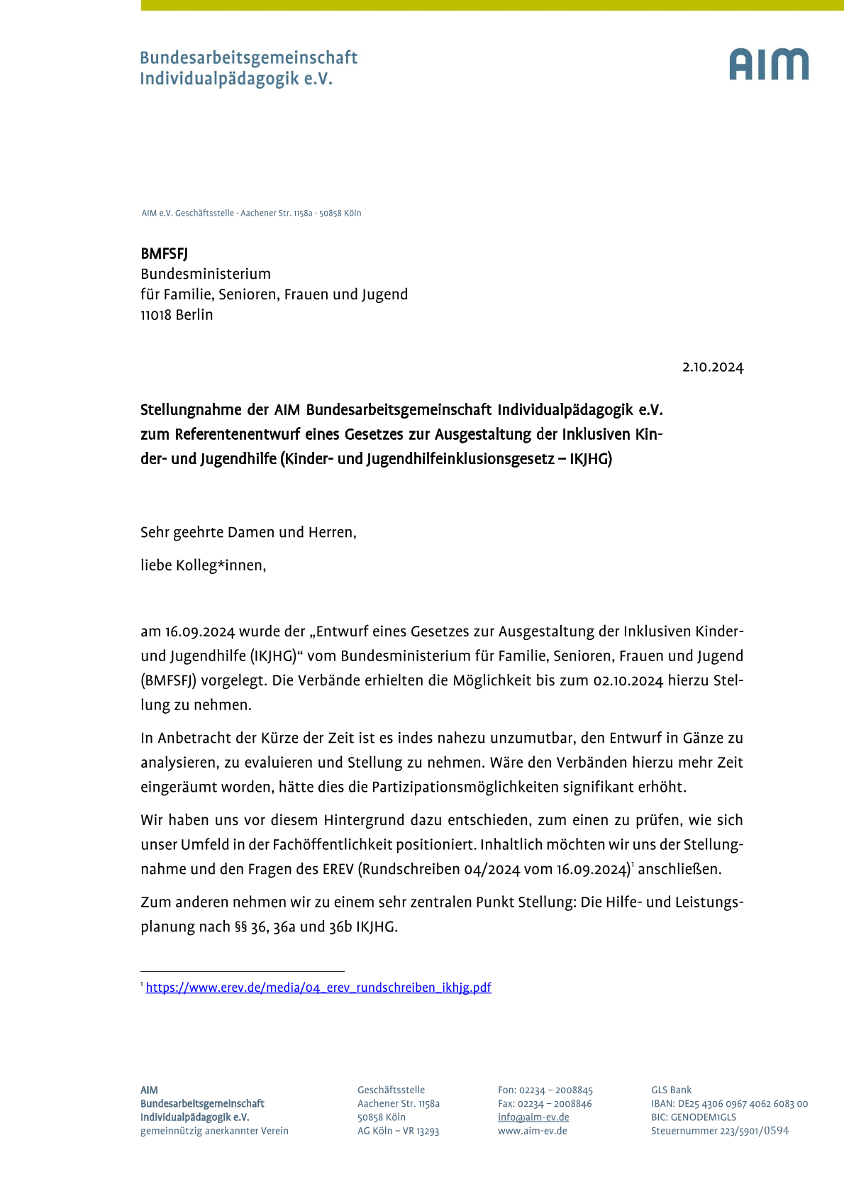 Der Vorstand der AIM Bundesarbeitsgemeinschaft Individualpädagogik e.V. legt dem Bundesministerium für Familie, Senioren, Frauen und Jugend (BMFSFJ) seine Stellungnahme zum Referentenentwurf eines Gesetzes zur Ausgestaltung der Inklusiven Kinder- und Jugendhilfe (Kinder- und Jugendhilfeinklusionsgesetz – IKJHG) vor.